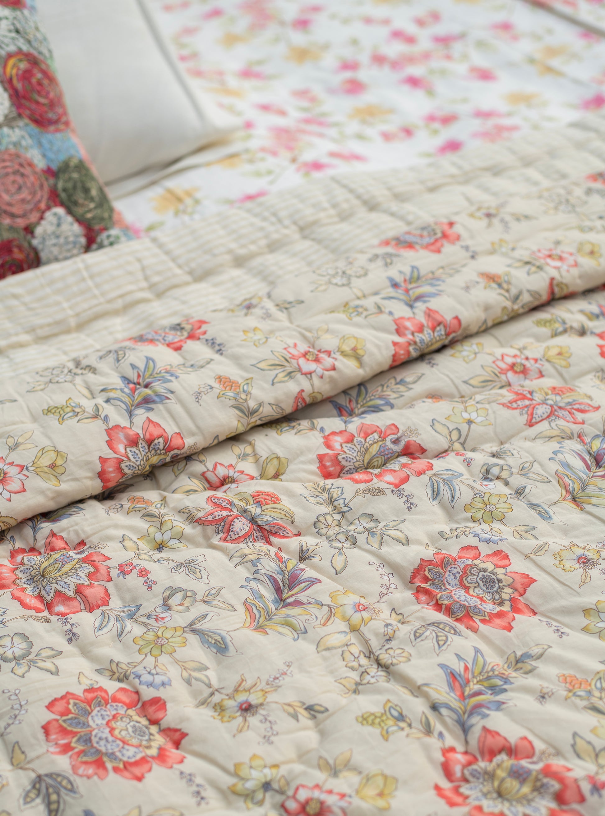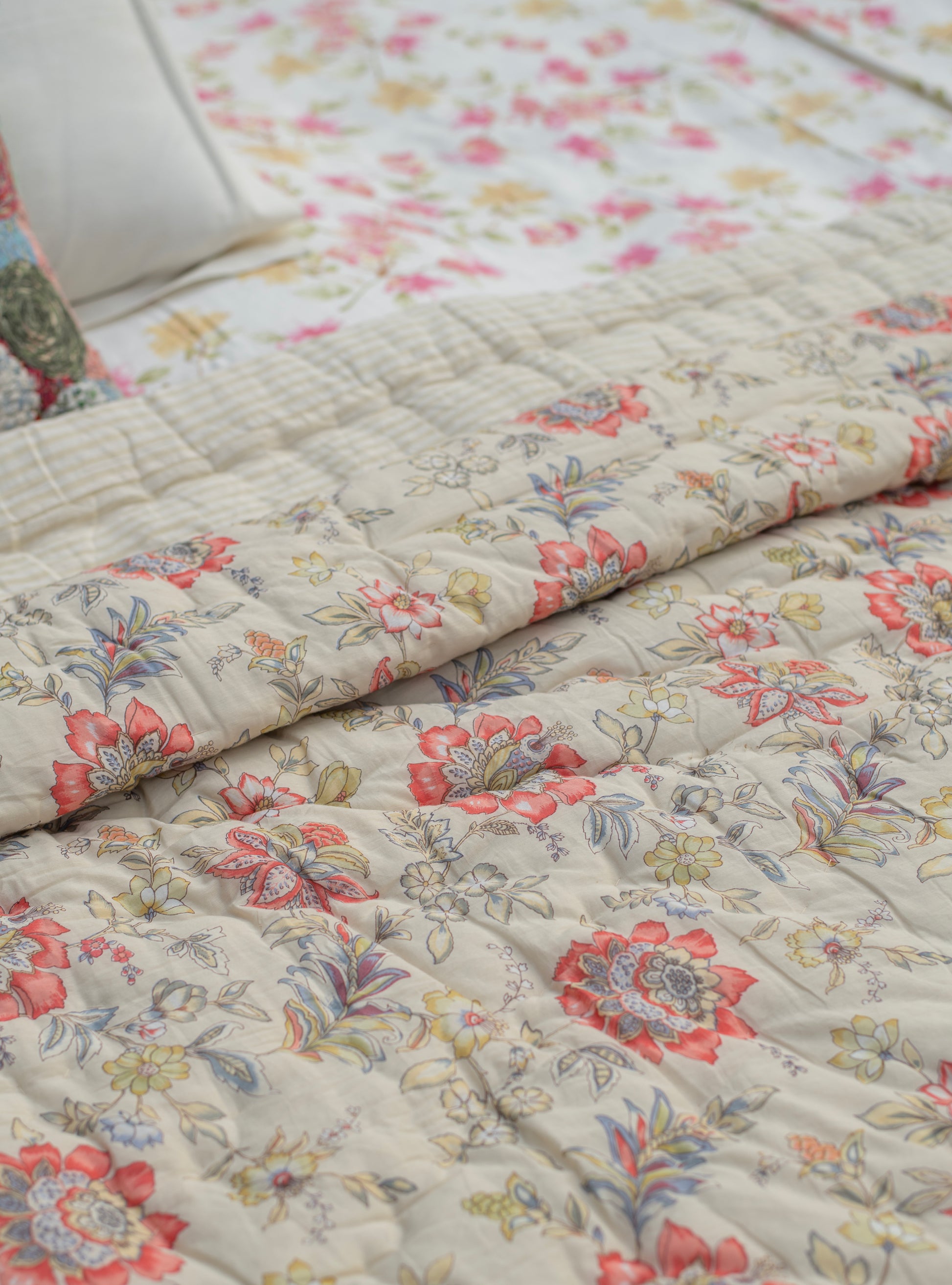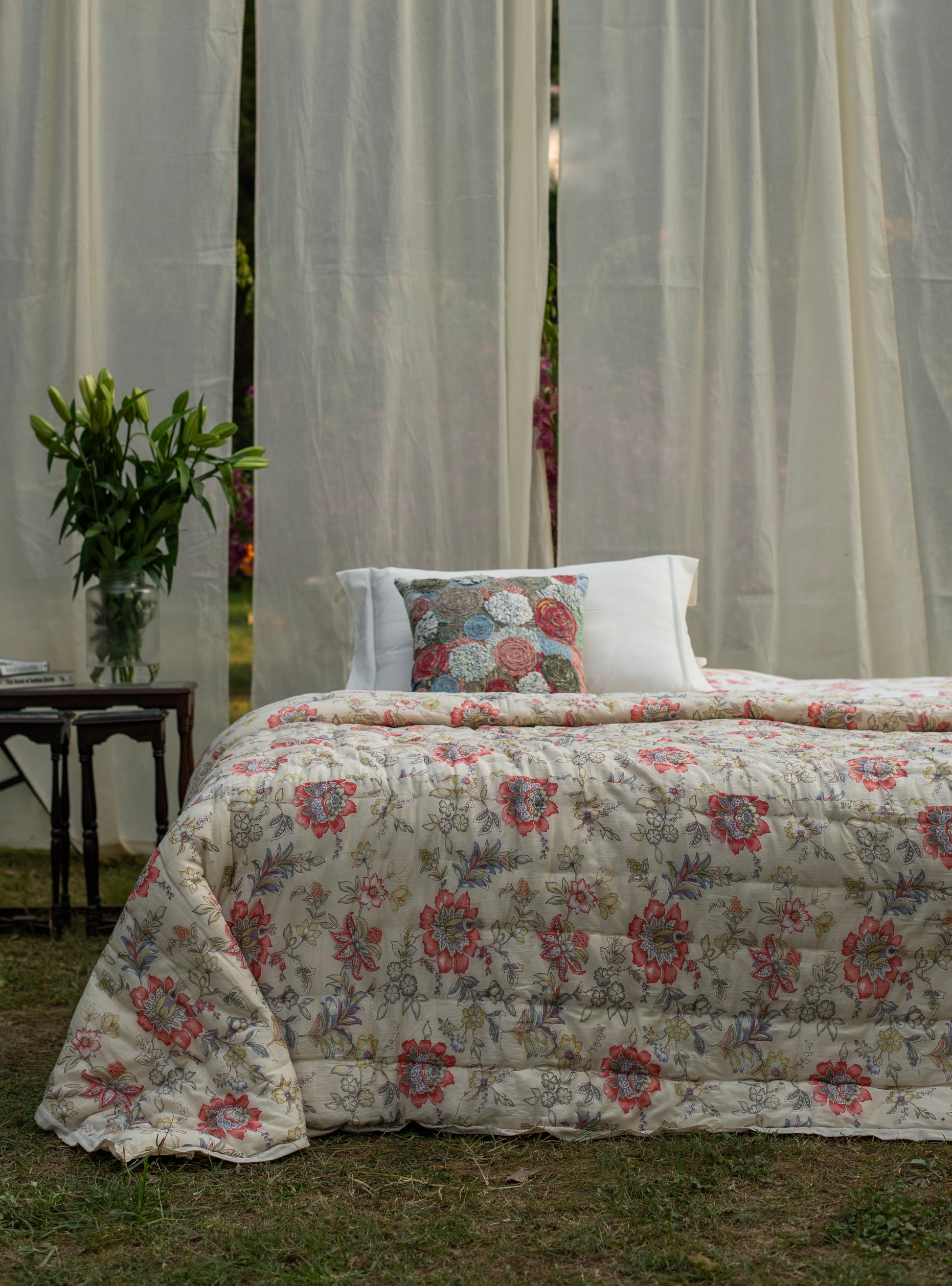 Elevate your bedroom with this sophisticated reversible quilt, featuring a striking Rio print on one side and luxurious ivory voile on the reverse. The breathable voile fabric ensures optimal comfort across seasons, while the reversible design offers versatile styling options. Perfect for those who appreciate quality craftsmanship and understated elegance, this quilt seamlessly transitions from bold statement piece to serene neutral backdrop. Ideal for layering or standalone use, it brings both visual interest and functional comfort to your sleep space.