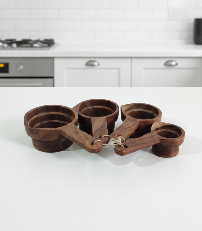 Precision meets natural elegance with this four-piece wooden measuring cup set. Crafted from sustainably sourced wood, each cup features clear metric and imperial markings for accurate ingredient measurement in baking and cooking. The lightweight, ergonomic design ensures comfortable handling, while the warm wood finish complements any kitchen aesthetic. Ideal for both everyday cooking and professional-grade results.