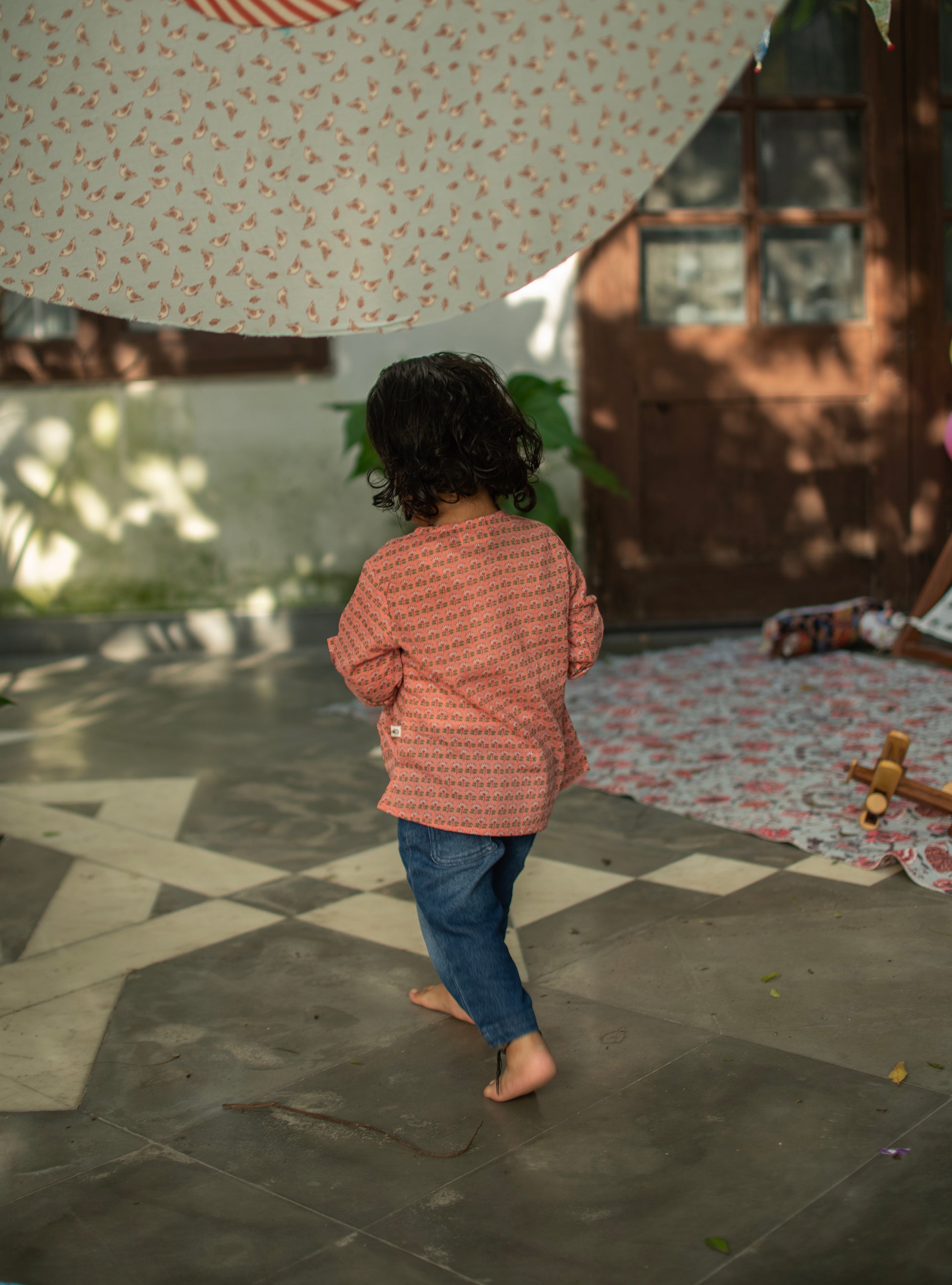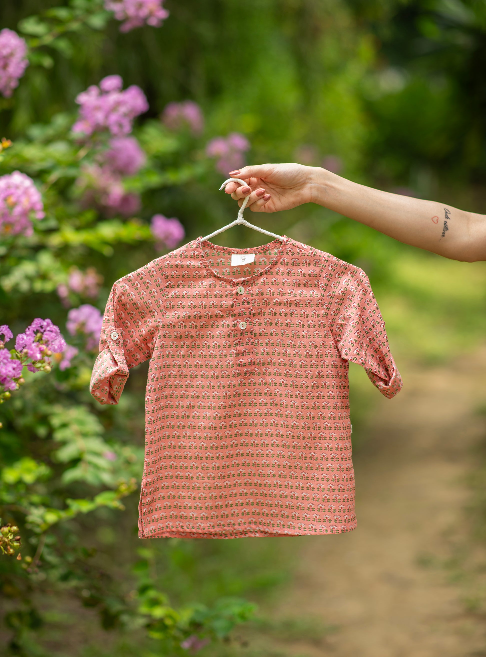 The Kids Classic Kurta in Kamal Booti Blush Voile features delicate hand-block printed motifs on soft, breathable voile fabric, designed to keep your child comfortable while reflecting traditional Indian craftsmanship. Its timeless silhouette offers ease of movement and a refined look suitable for festive occasions or casual wear, making it an elegant addition to any young wardrobe.