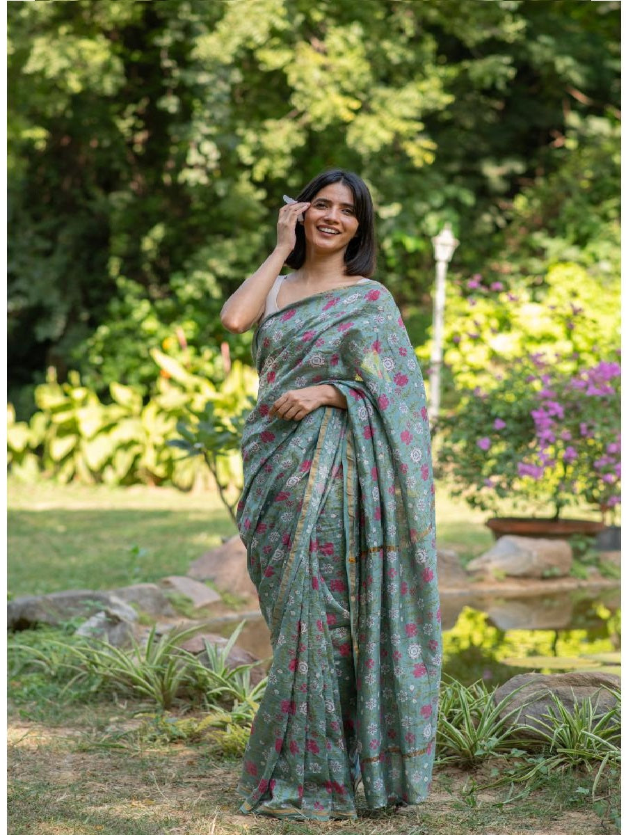 Effortlessly elegant, this saree is crafted from Chanderi Silk and handprinted for a unique touch. With its lightweight and breathable fabric, it offers a comfortable and stylish option for any occasion. Elevate your ethnic wardrobe with this expertly crafted piece.