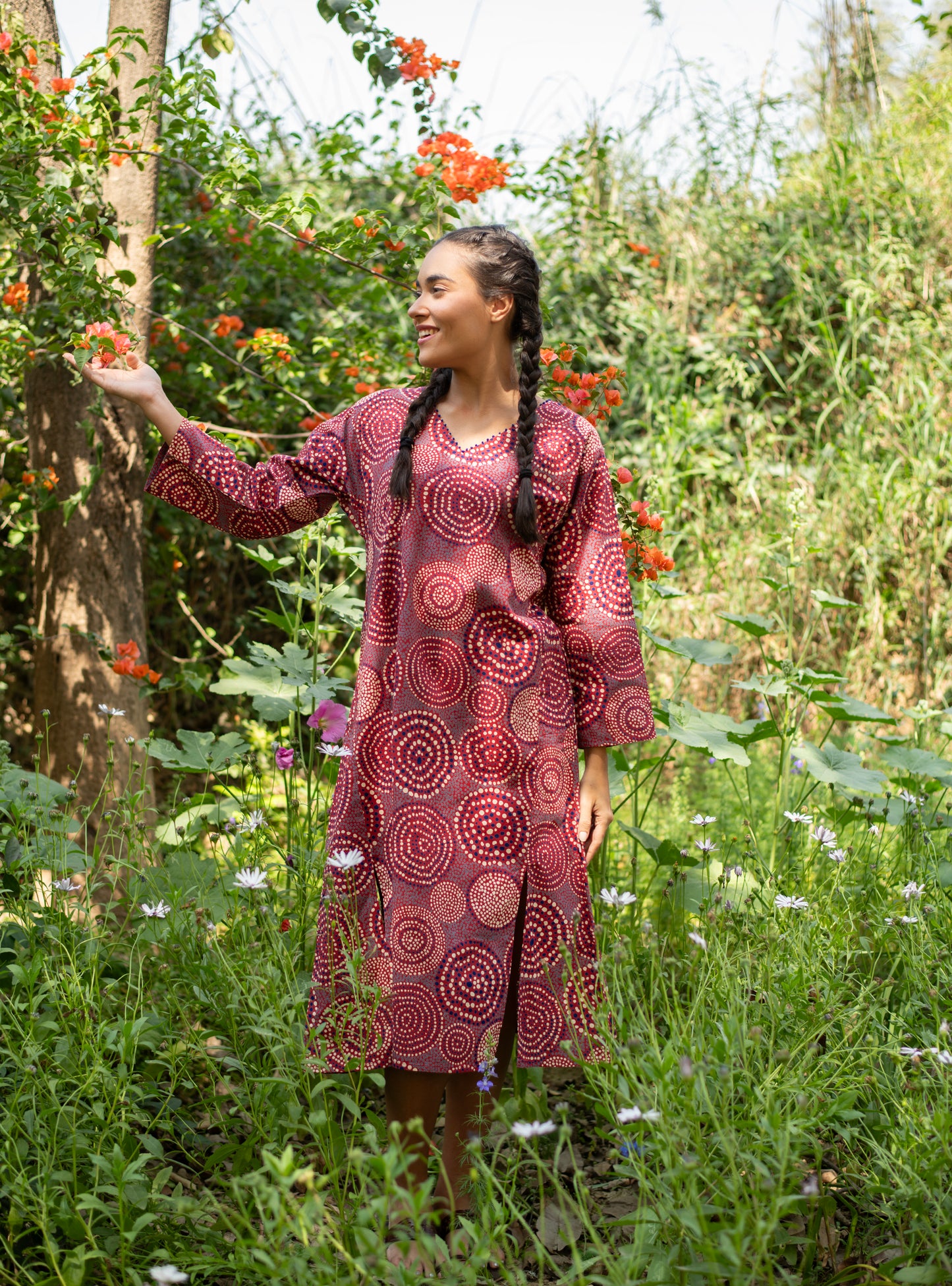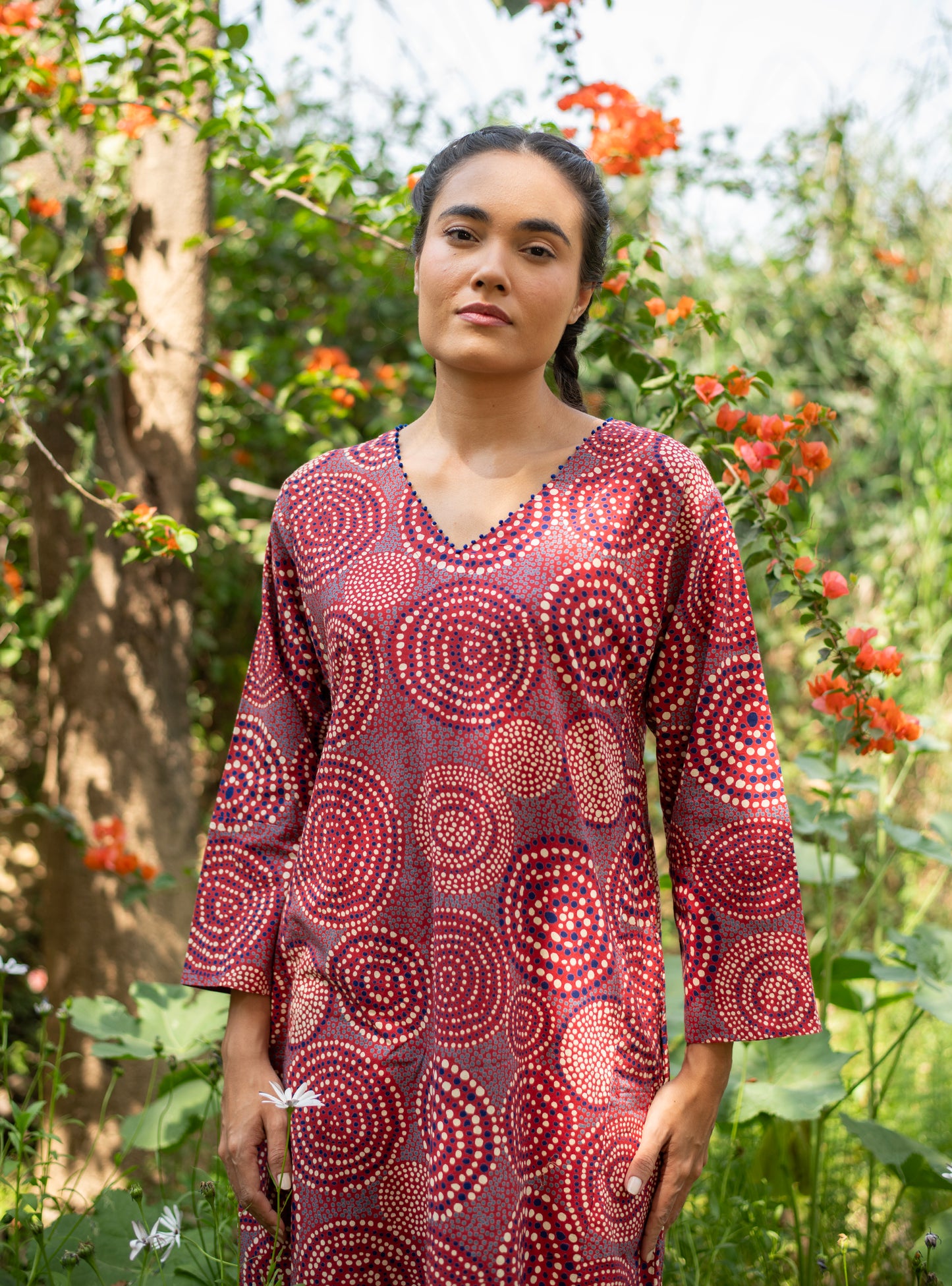 Our Mala Kaftan in Red with bold polka dots adds a touch of elegance to any outfit. Made with high-quality fabric, this kaftan is both comfortable and stylish, perfect for any occasion. Experience the luxurious feel and timeless design of our Mala Kaftan.