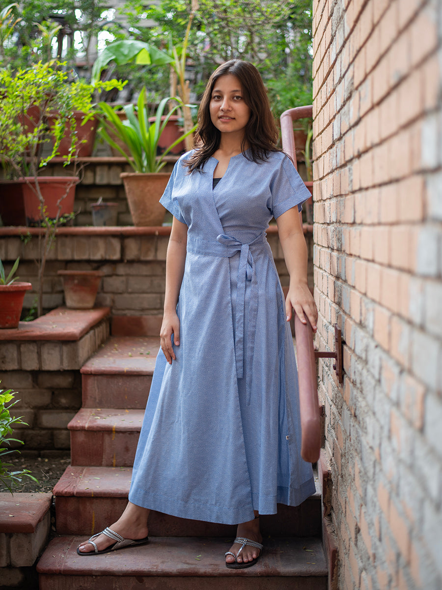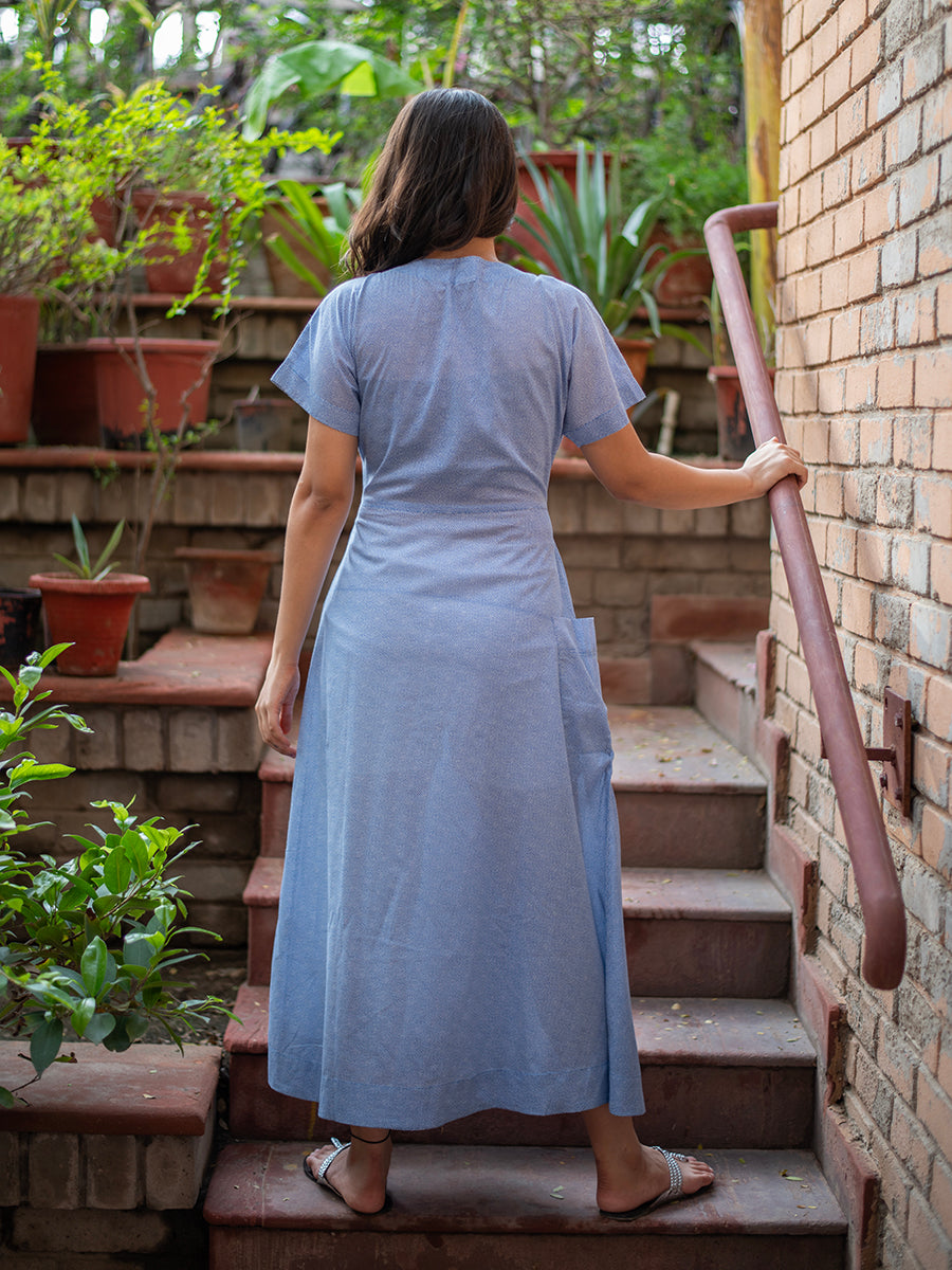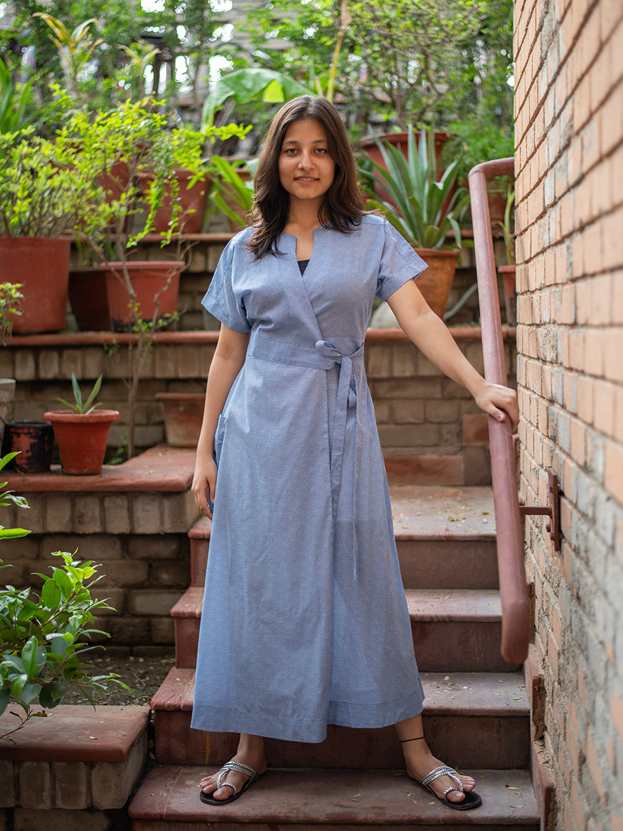 Experience the comfort of our Pocket Wrap Dress, expertly crafted in soft cotton with a delightful floral pattern. It boasts a wrap-over front, waist-cinching tie belt, half sleeves, a slightly raised sweetheart neck, and a gracefully flared skirt.